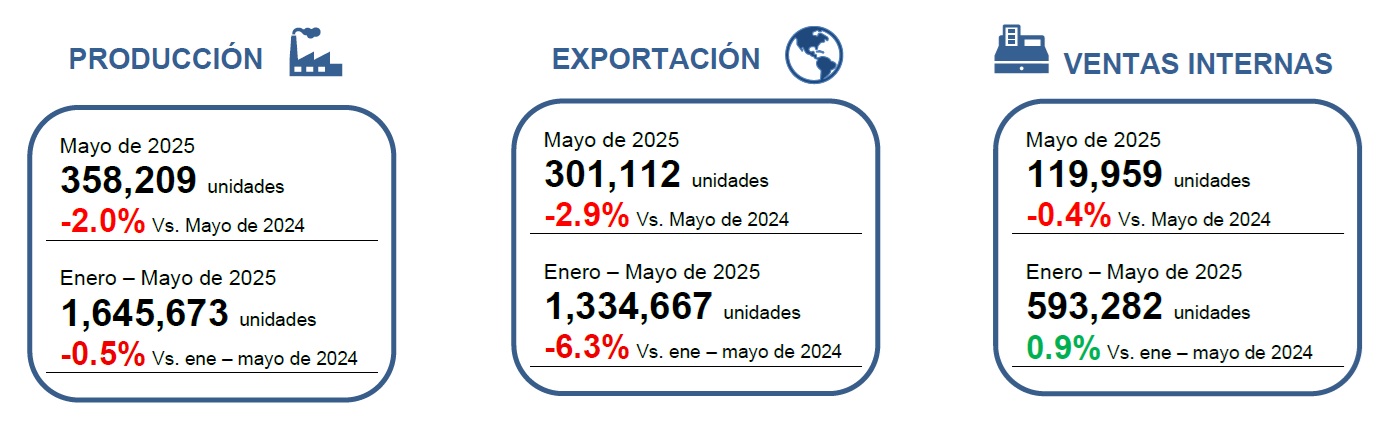 En el acumulado enero-mayo, se han producido más de 1.6 millones de unidades, lo que representa una disminución del 0.5% en comparación con el mismo periodo de 2024. Esta cifra constituye el tercer mejor resultado histórico para un acumulado, únicamente superado por el observado en los años 2019 y 2024.