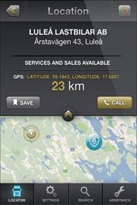 El Scania Dealer Locator puede ser utilizado en el momento en que se necesite y lo asistirá al instante. A través de esta aplicación el conductor puede contactarse con Scania Assitance por cualquier desperfecto, o bien localizar concesionarios o talleres autorizados en un mapa y recibir indicaciones para llegar. Adicionalmente, los operadores pueden personalizar la aplicación y agregar sus destinos favoritos o planear con anticipación las rutas a seguir.