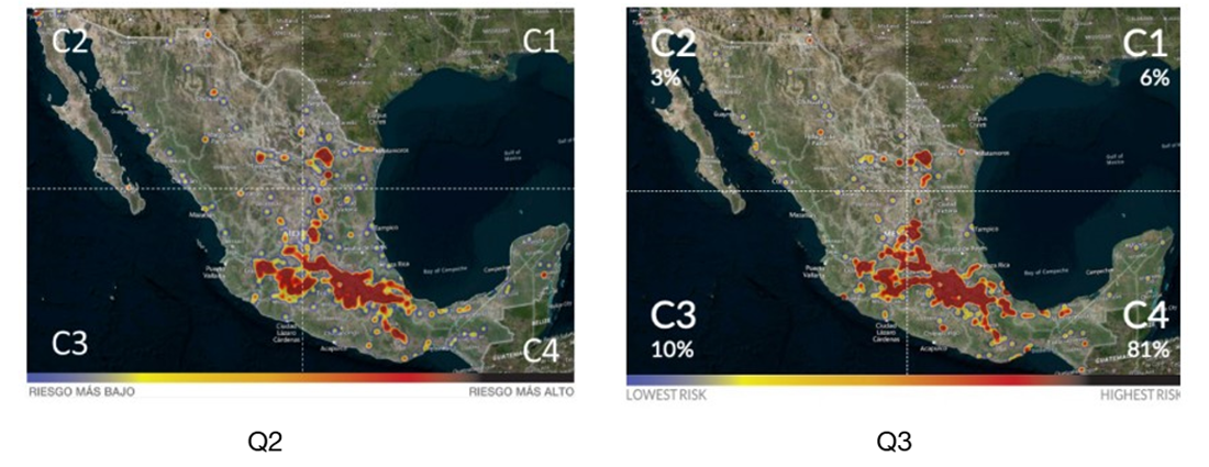El análisis espacial revela que más del 50% de los eventos de robo de carga se han localizado en el cuarto cuadrante, específicamente en la Región Central y Sureste. Esta zona no sólo concentró la mayoría de los robos, sino que también experimentó un desplazamiento significativo durante el tercer trimestre. En comparación con el segundo trimestre, observamos un cambio de un punto porcentual, lo que sugiere que el problema se ha intensificado en el centro del país. Seis estados dentro de este cuadrante se encuentran entre los diez con mayor porcentaje de robos de carga.