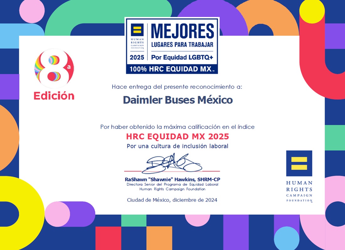 Con este enfoque, Mercedes-Benz Autobuses ha sido reconocida por el Human Rights Campaign Programa Global de Equidad Laboral como uno de los Mejores Lugares para Trabajar LGBT+. Este reconocimiento la posiciona como una de las 261 empresas en todo México y una de las 12 en el sector automotriz en obtener esta certificación, reafirmando su compromiso con la diversidad, la equidad y la inclusión.