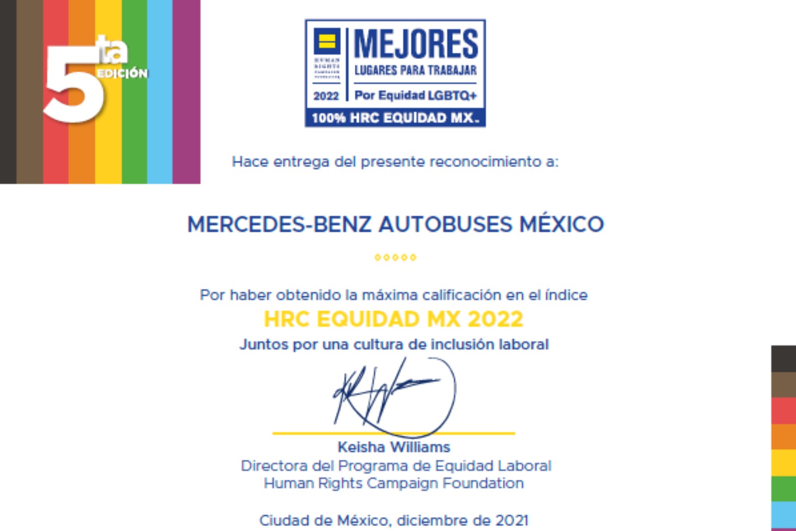 Mercedes-Benz Autobuses recibió por tercer año consecutivo, el certificado HRC Equidad MX, por implementar y promover políticas de no discriminación, creación de grupos de recursos para trabajadores o consejos de diversidad e inclusión, así como actividades públicas para apoyar la integración LGBT.