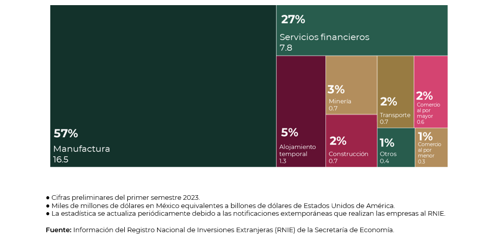 IED en México por sector en el primer semestre de 2023 (miles de millones de dólares):