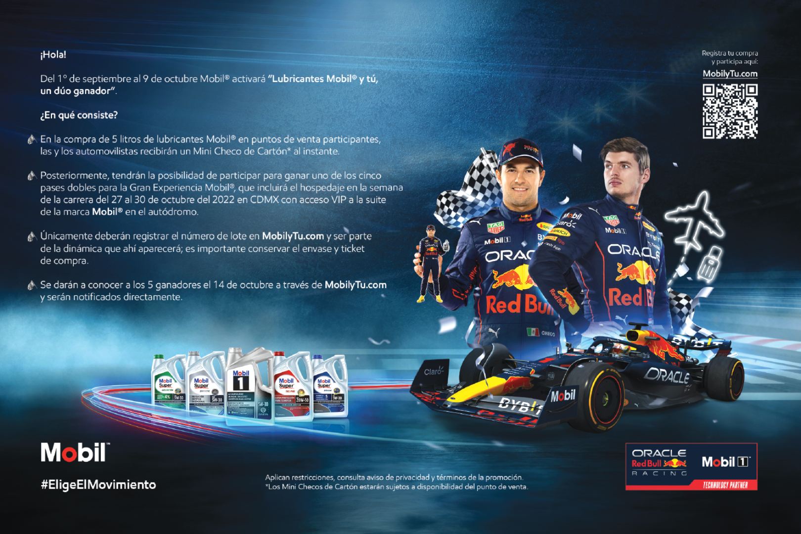 Esta promoción estará vigente del 1 de septiembre al 9 de octubre del 2022 y para participar, las y los automovilistas deberán comprar 5 litros de lubricantes Mobil en diversos puntos de venta para recibir un mini Checo de Cartón de manera automática*.