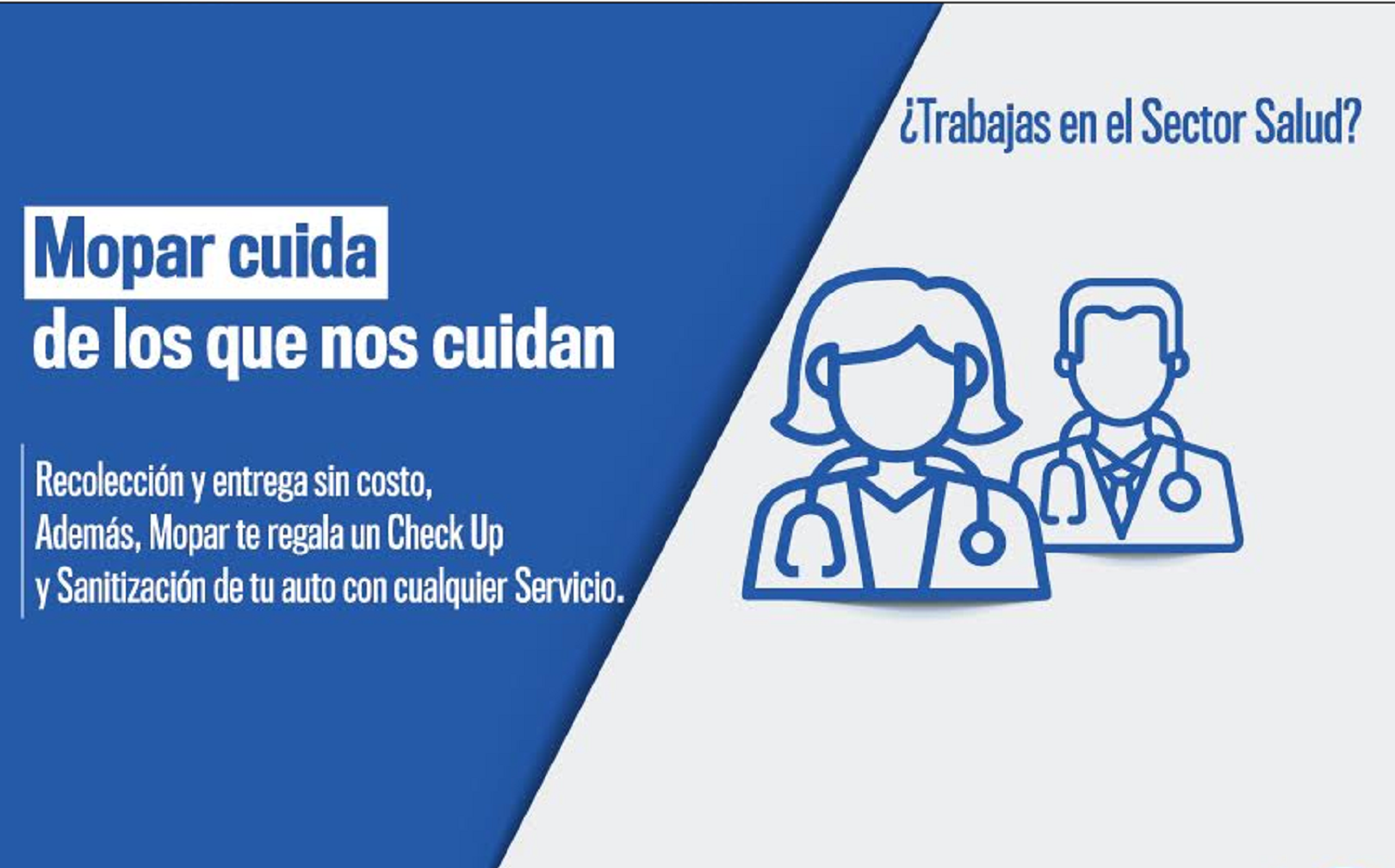 Con la finalidad de apoyar al personal del sector salud, Mopar México lanza la campaña “Mopar cuida de los que nos cuidan” la cual consiste en que cualquier persona que pertenezca a este sector y que desee realizarle a su vehículo algún servicio de mantenimiento, pueda hacerlo sin preocuparse por el punto de recolección y entrega.