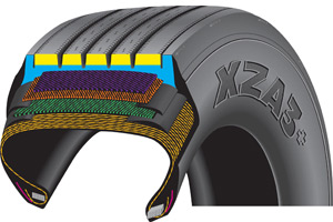 La XZA3 + EVERTREAD ofrece un 30% más de kilometraje que la competencia, debido a la nueva generación de tecnología Co-EX con Compuesto Dual. Esta tecnología permitió a los diseñadores de la llanta utilizar múltiples compuestos de hule en diferentes lugares de la banda de rodamiento.