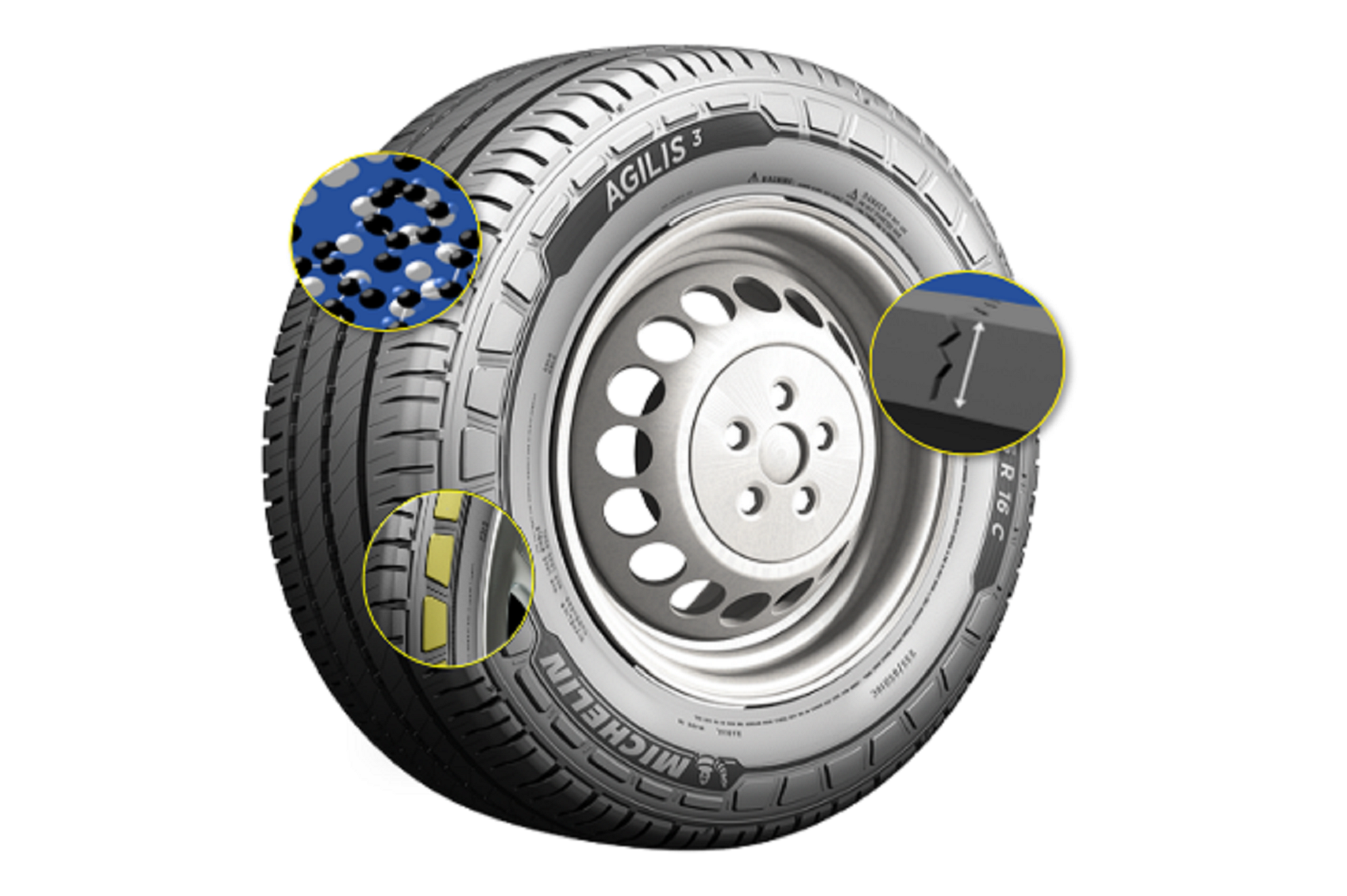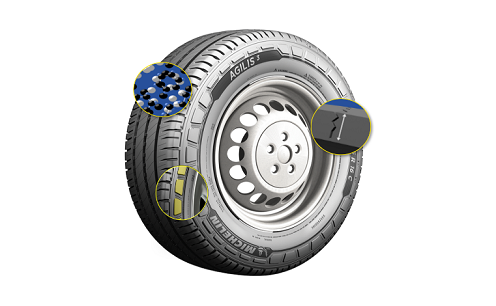 - Más ecológica: una llanta producida con materiales sustentables; contiene -1.6 kg por llanta vs Agilis + y reduce 1.3 kg/CO2 cada 1,000 km por llanta