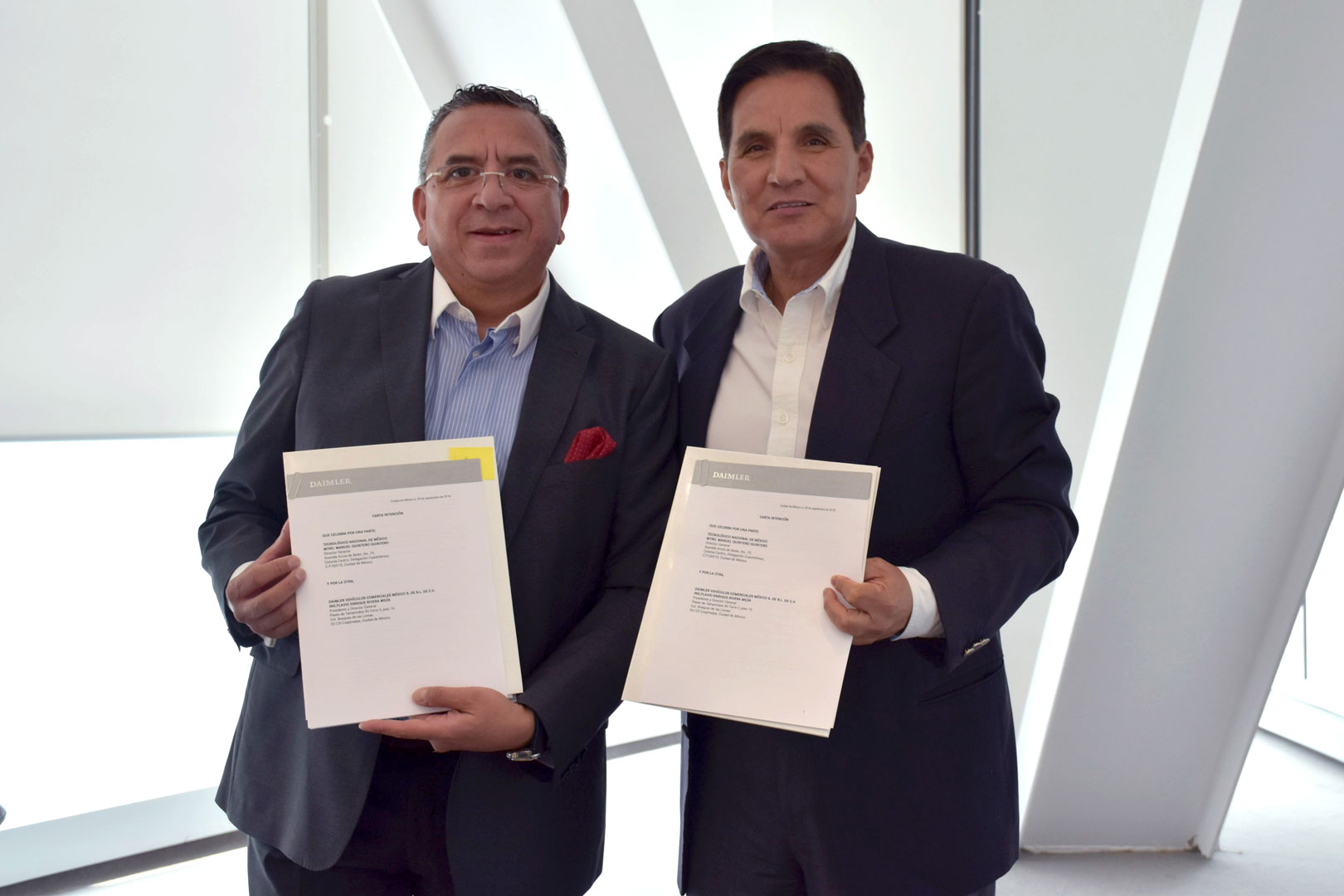 Ante la presencia de directivos de ambos organismos, Flavio Rivera, Presidente y Director General de Daimler Vehículos Comerciales y Manuel Quintero Quintero, Director General del TecNM, firmaron el acuerdo de colaboración.
