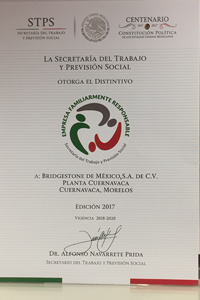 El distintivo de “Empresa Familiarmente Responsable 2017” recibido por la Planta de Bridgestone en Cuernavaca, se suma al obtenido por las Oficinas Corporativas de Bridgestone México en 2016, con lo que se reafirma el compromiso de la compañía para con sus colaboradores.