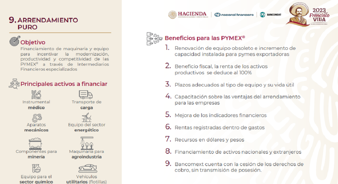 Entre los programas de financiamiento que están disponibles destacan los Créditos para Financiamiento a contratos de la cadena automotriz y de autopartes, o Arrendamiento puro. Aquí puedes consultar la lista de los Productos Financieros 2023: https://www.nafin.com/portalnf/files/doctos-2023/Productos-Financieros-NF-BMXT-23.pdf