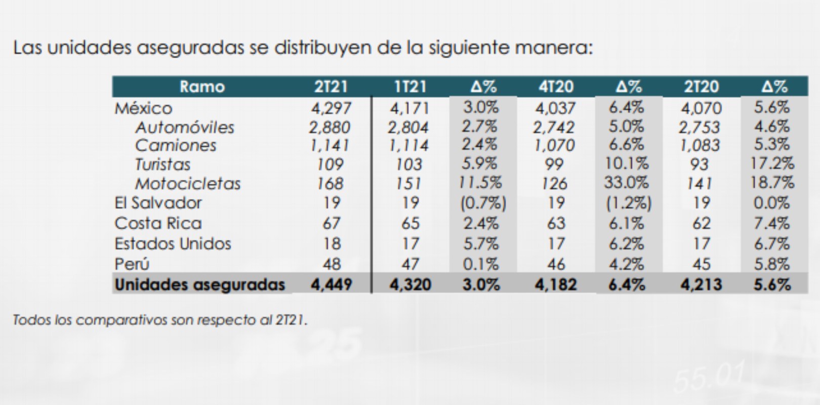 “Cerramos el trimestre con más de 4.4 millones de unidades aseguradas, sentando un nuevo récord en la compañía. Lo anterior representa un incremento del 3.0% respecto al trimestre inmediato anterior y 266,826 unidades aseguradas más respecto al cierre del 2020”, añadió el comunicado.
