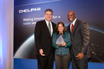 Matthew Pohlman, Vicepresidente de Proveedores Global, y Sidney Johnson, Vicepresidente PG de Delphi, respectivamente, entregaron el reconocimiento del Pinnacle Award a Laura G. Mejía.