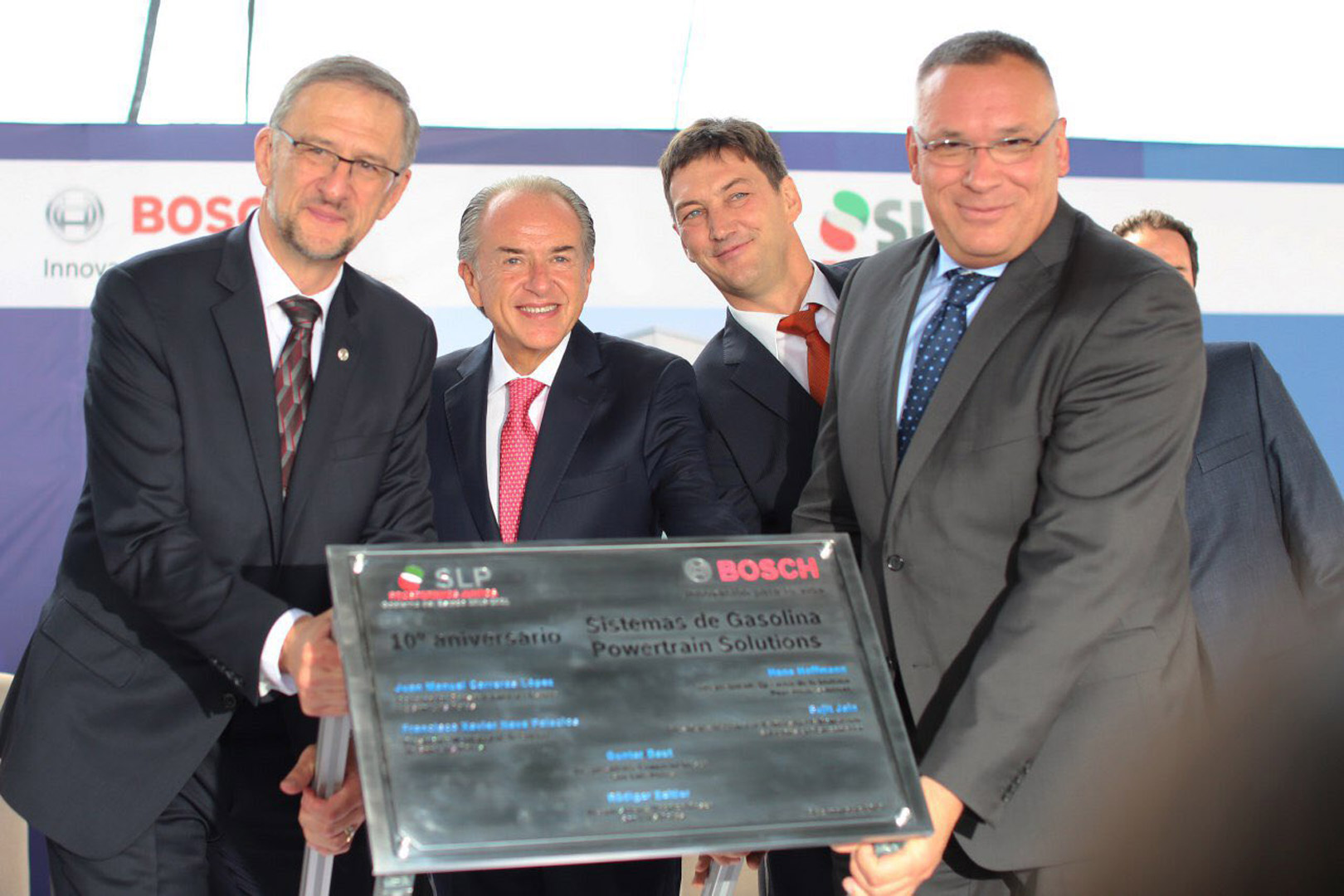 En su intervención, Gunter Daut, vicepresidente comercial, y Rudiger Zeitler, vicepresidente técnico de la planta Robert Bosch SLP, hicieron un recuento de la historia de la empresa, que comenzó como Bendix y que en el año 2009 tuvo que despedir a la mayoría de empleados debido a la transferencia de operaciones a otras plantas; en 2009 y 2010 enfrentó la crisis financiera de Norteamérica, con inversiones mínimas de 25 millones de dólares en los primeros 6 años.
