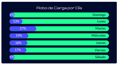 Hacia el fin de semana, la incidencia de los robos disminuye notablemente. El sábado se produjo el 5% de los robos, y el domingo fue el día de menor incidencia, con sólo el 2%. Este descenso puede estar relacionado con la reducción de las operaciones de transporte y la actividad logística durante los fines de semana, así como con un posible aumento de las medidas de vigilancia y seguridad durante estos días.