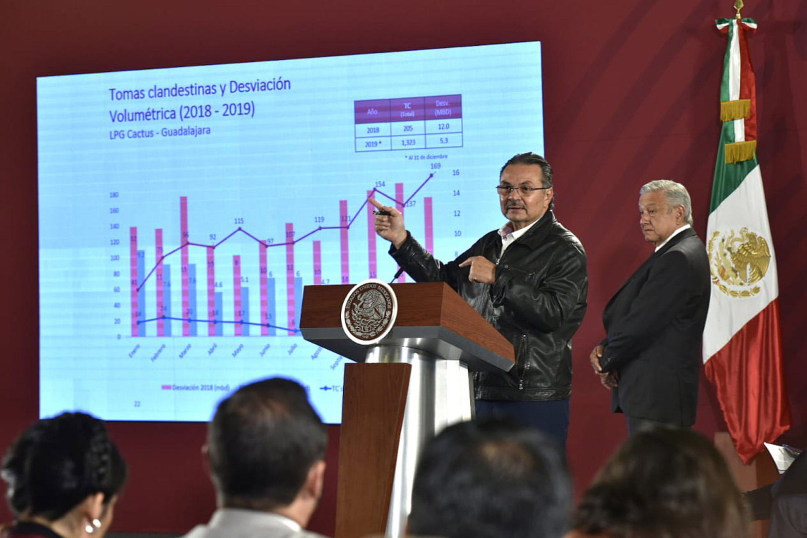 El titular de Pemex informó que actualmente el robo de combustible es de 5 mil barriles diarios, equivalentes a 15 millones de pesos y el plan establece como meta para este 2020 reducir esta cifra a 2 mil 500, así como prohibir la venta de válvulas utilizadas para las tomas clandestinas y colocar colchacreto a lo largo de 175 kilómetros sobre los ductos.