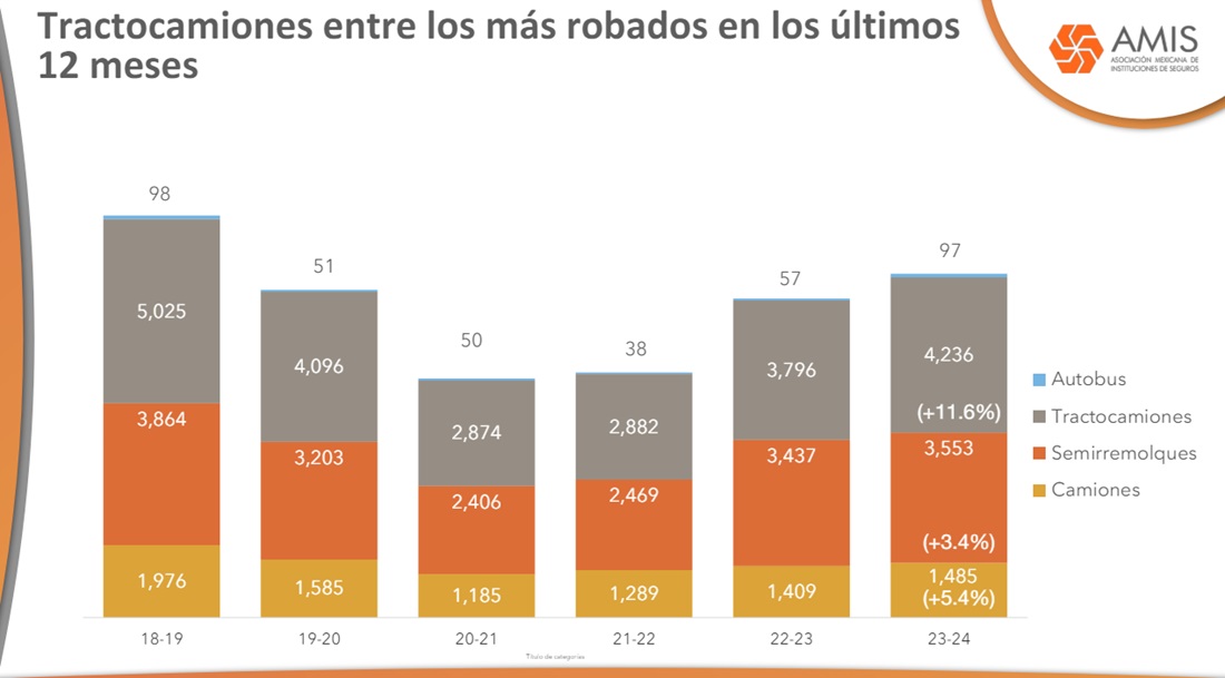 Asimismo, destacó que los tractocamiones se ubican como los más robados del segmento pesados con 4,236 unidades del total.