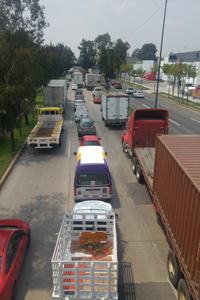 Posteriormente los semirremolques con jaula ganadera, los semirremolques de volteo, los semirremolques dolly, y luego sigue el tractocamión International, continúan otros semirremolques y después el tractocamión Dina.
