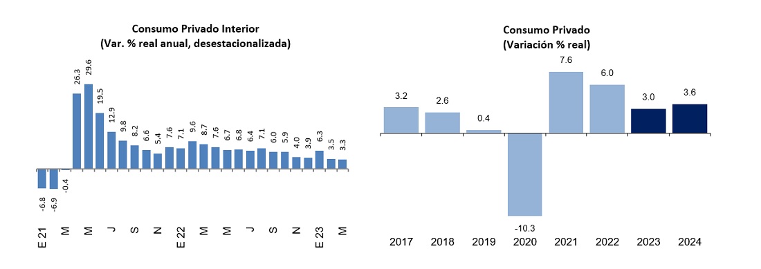 «El consumo privado interior creció 0.3% en marzo vs febrero. En su vista mensual, normalmente se alternan entre avances y retrocesos, como es usual cuando se analizan las cifras en “el margen”. De cualquier forma, el número fue positivo y eso es bueno. Lo relevante es que el consumo privado creció 3.3% real anual en marzo, reportando una moderación y siendo su tasa más baja en esta coyuntura de normalización de la economía, eliminando la caída de 2020 y el rebote de 2021″, de acuerdo con el nuevo estudio económico de Engen Capital.