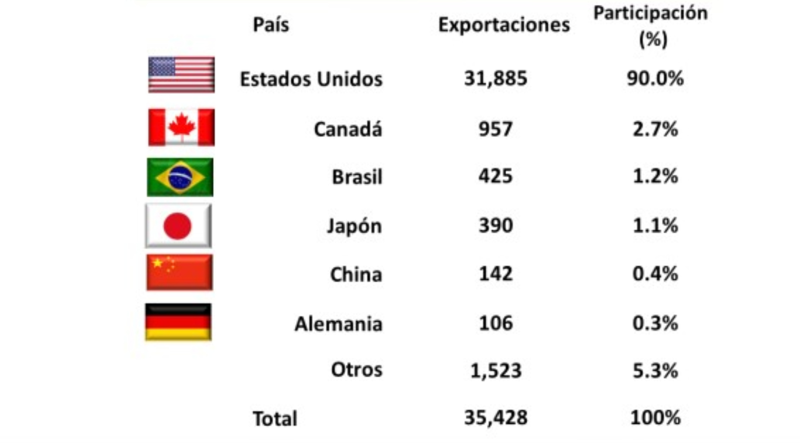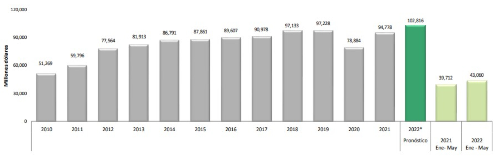 Por otra parte, durante el periodo enero – mayo 2022, las exportaciones se incrementaron un 8.55% en comparación al mismo periodo del año anterior, alcanzando los $35,428 millones de dólares. Destaca la región de Norteamérica con una participación del 92.7% del total de los envíos a otros mercados.