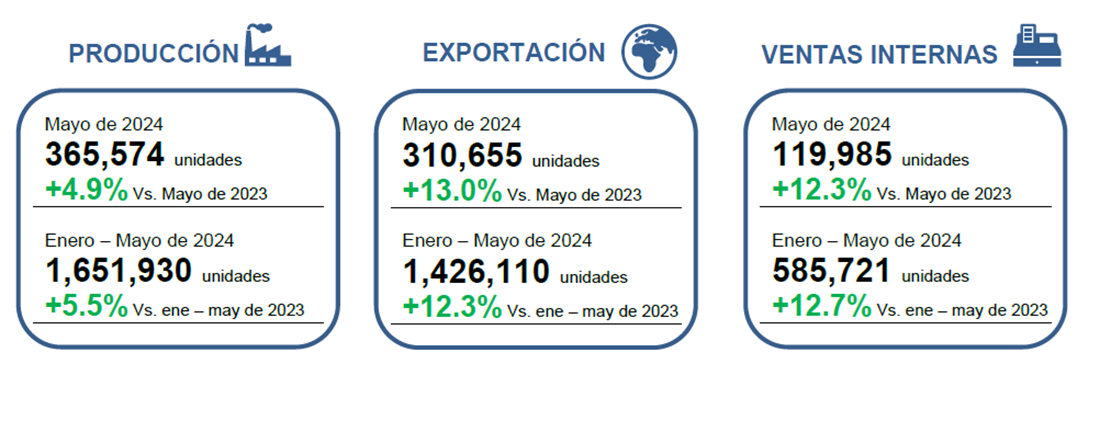 La producción y exportación para el mes de mayo de 2024 tuvieron desempeño sólido. Es el mayo más sólido desde 2005 tanto para la producción como para la exportación, año en que se inició el Registro Administrativo de la Industria Automotriz. Se produjeron 365,574 unidades, lo que representa un crecimiento del 4.9% en comparación con las cifras reportadas para el mismo mes de 2023, y un crecimiento del 5.5% para las cifras acumuladas de enero a mayo de 2024. En cuanto a las exportaciones, hubo un crecimiento del 13.0% al exportar 310,655 unidades; para el acumulado de enero a mayo de 2024, se registró un crecimiento del 12.3%.
